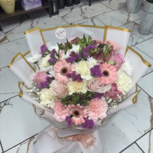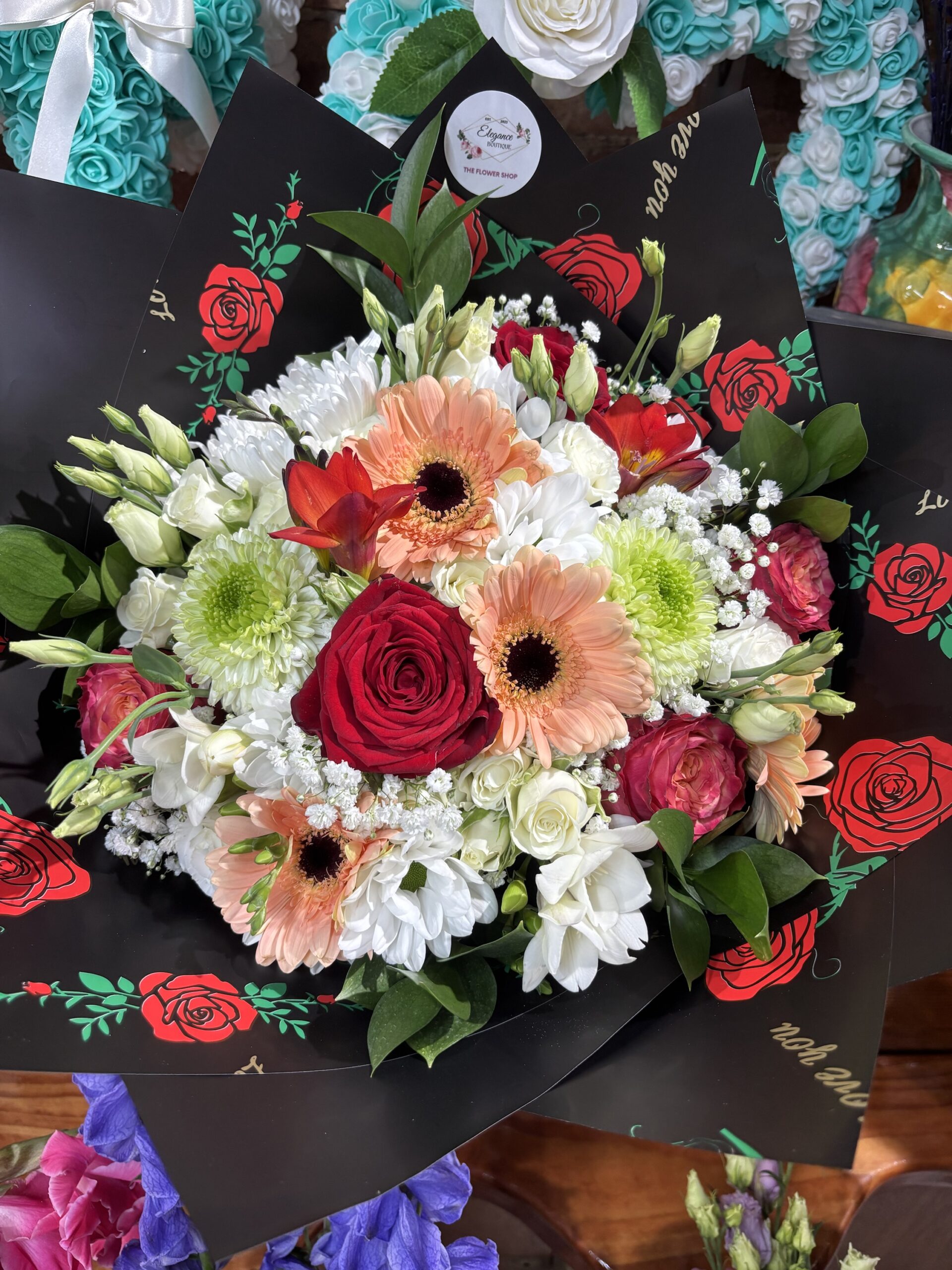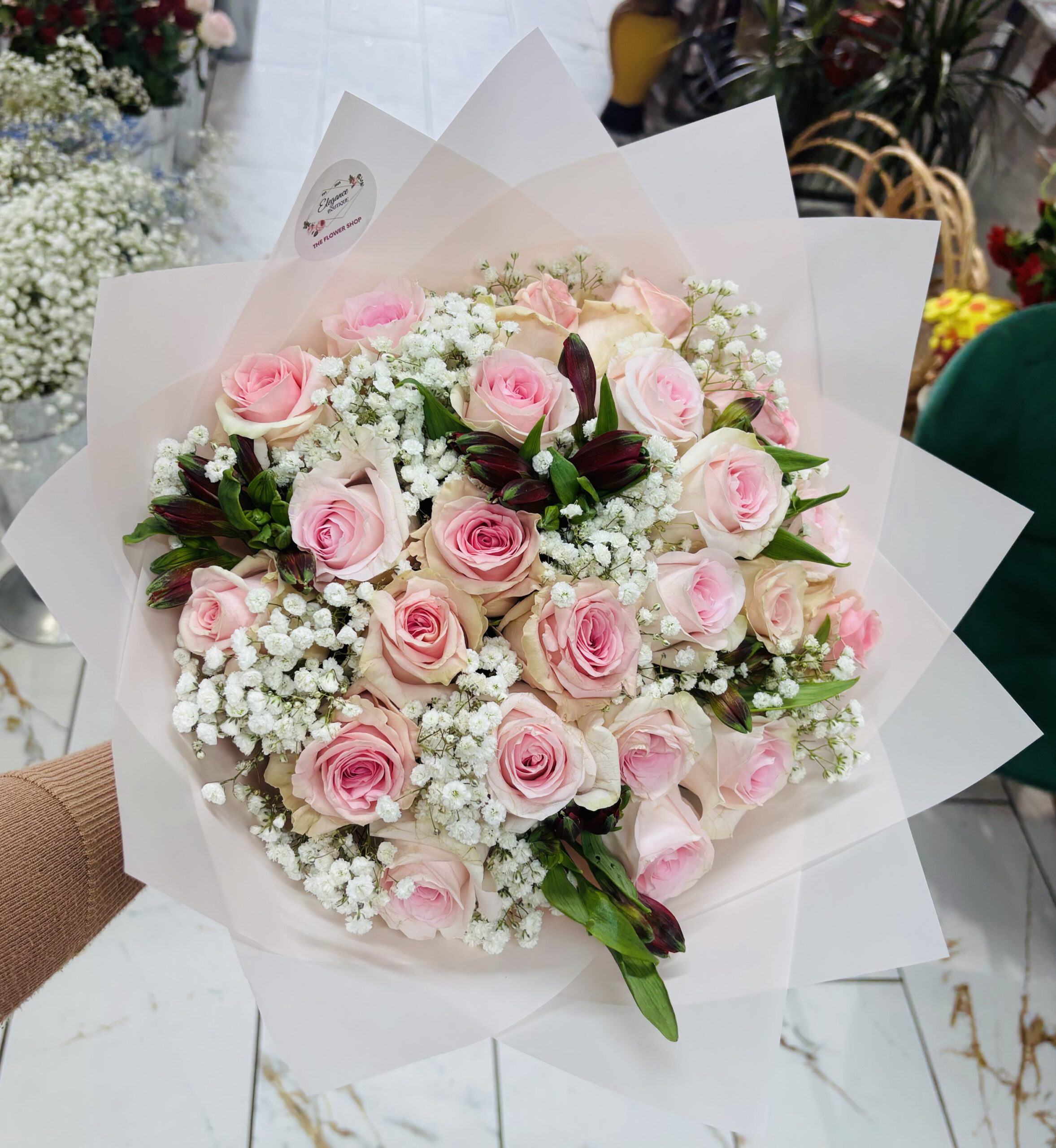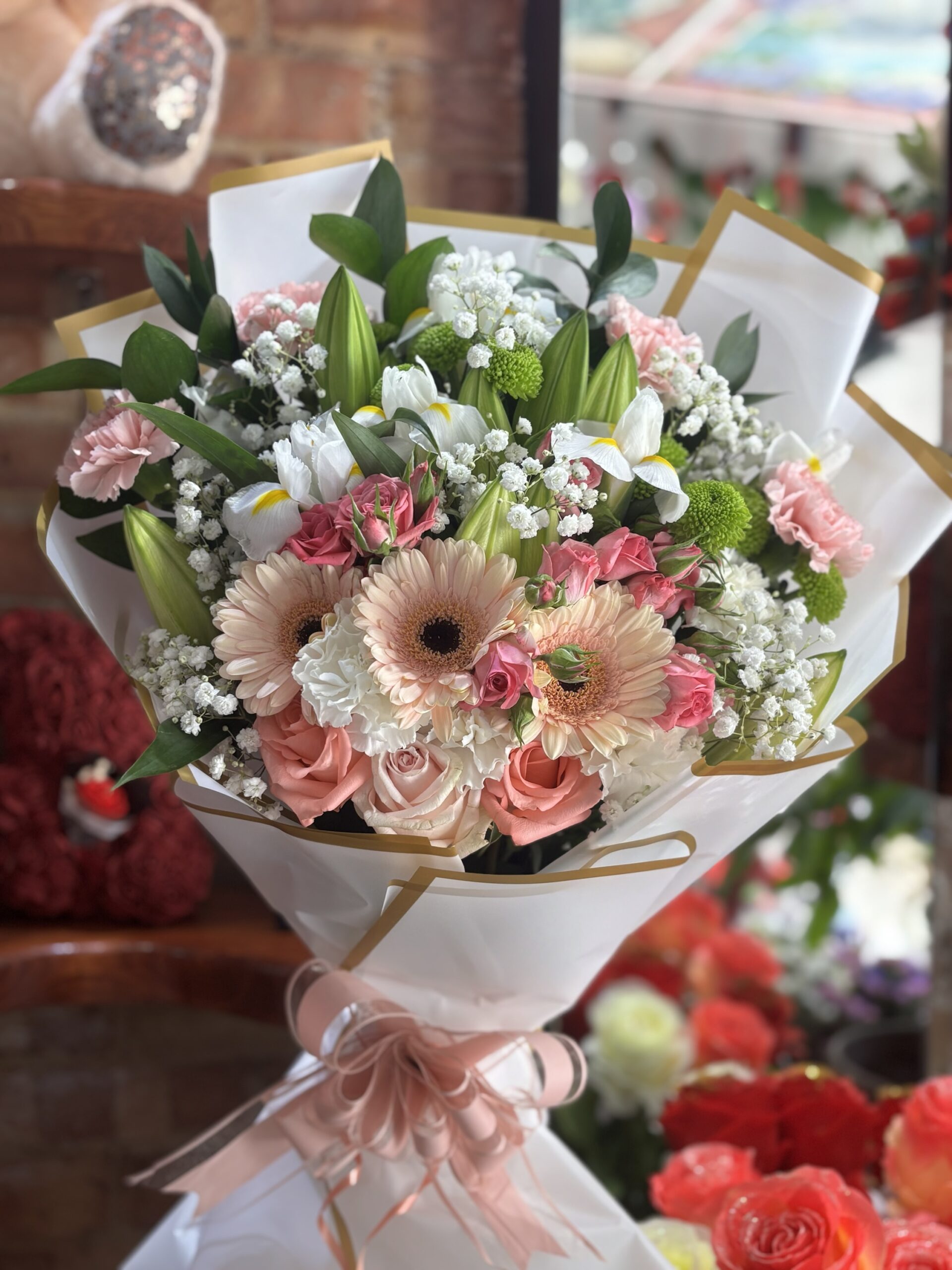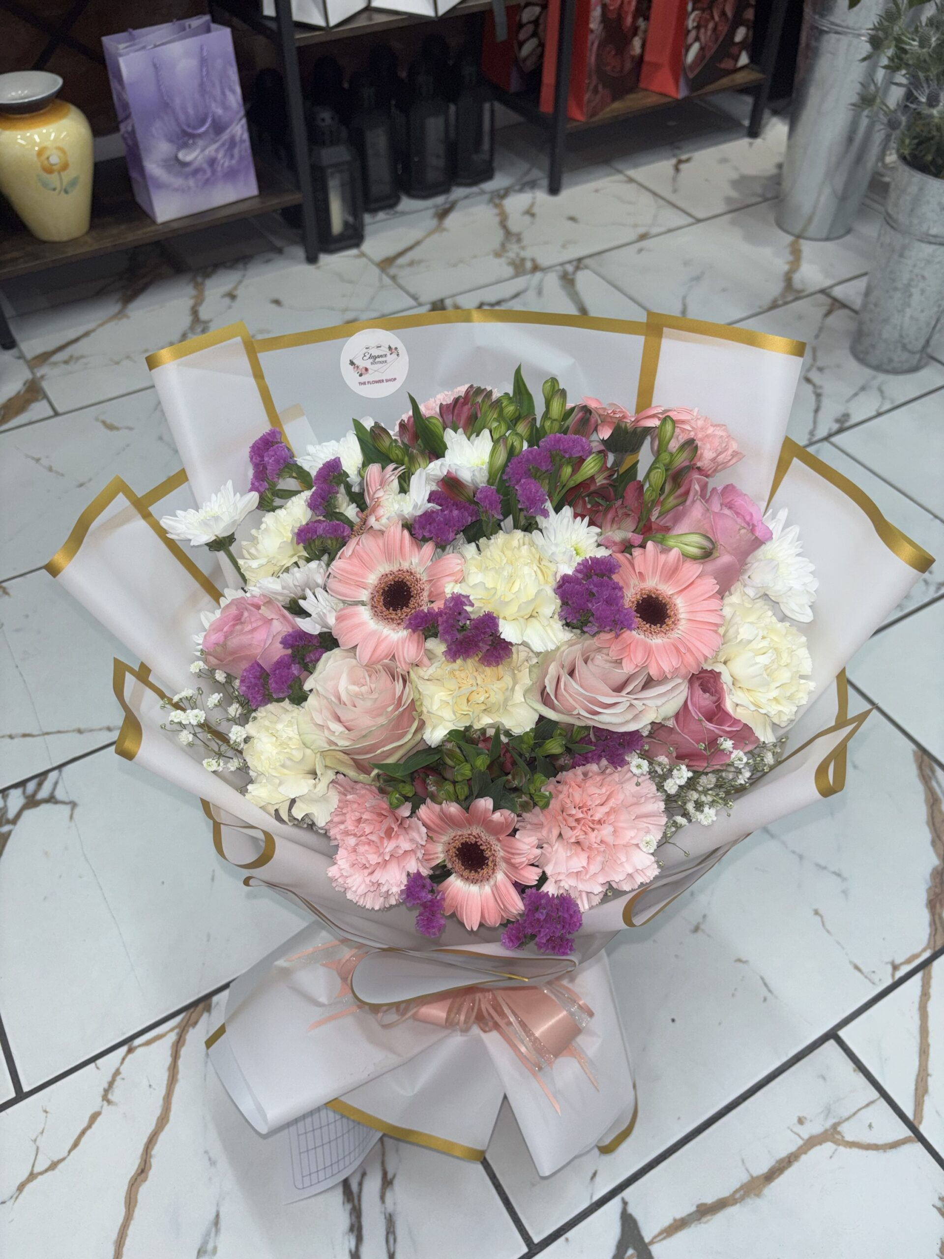 Each bouquet is unique. We use the freshest morning arrivals to ensure your gift lasts longer. To maintain beauty, trim stems 1cm and change the water every two days.