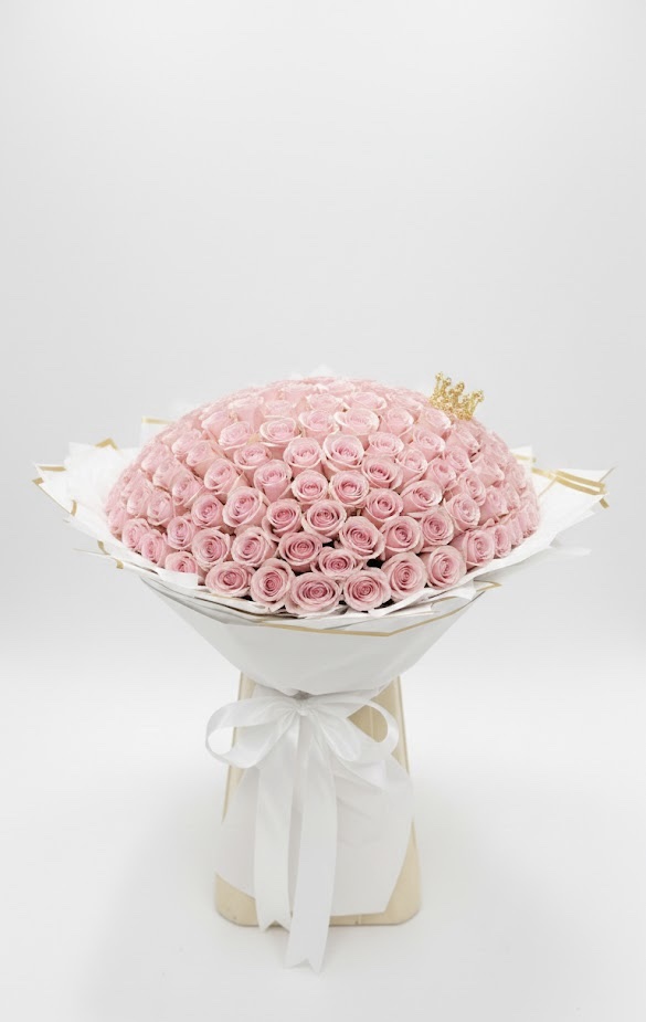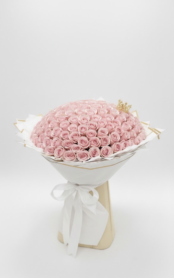 masterpiece of grace and royalty. This luxurious dome features a sea of 100 premium blush pink roses, symbolizing admiration and sweetness. Crowned with a sparkling golden tiara and wrapped in pristine white designer paper, this bouquet is the ultimate tribute to the queen in your life. It’s a sophisticated, “clean” aesthetic that makes an unforgettable statement.