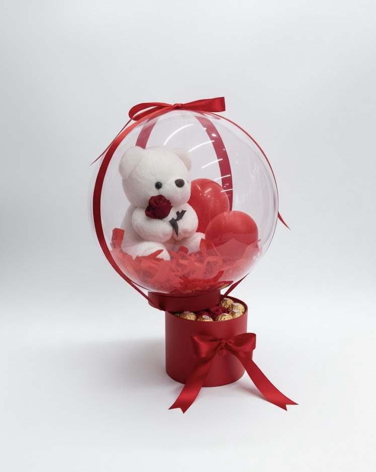 A passionate twist on a fan favorite. This luxury gift features a plush white teddy bear nestled inside a crystal-clear globe, accented with vibrant red balloons and silk ribbons.